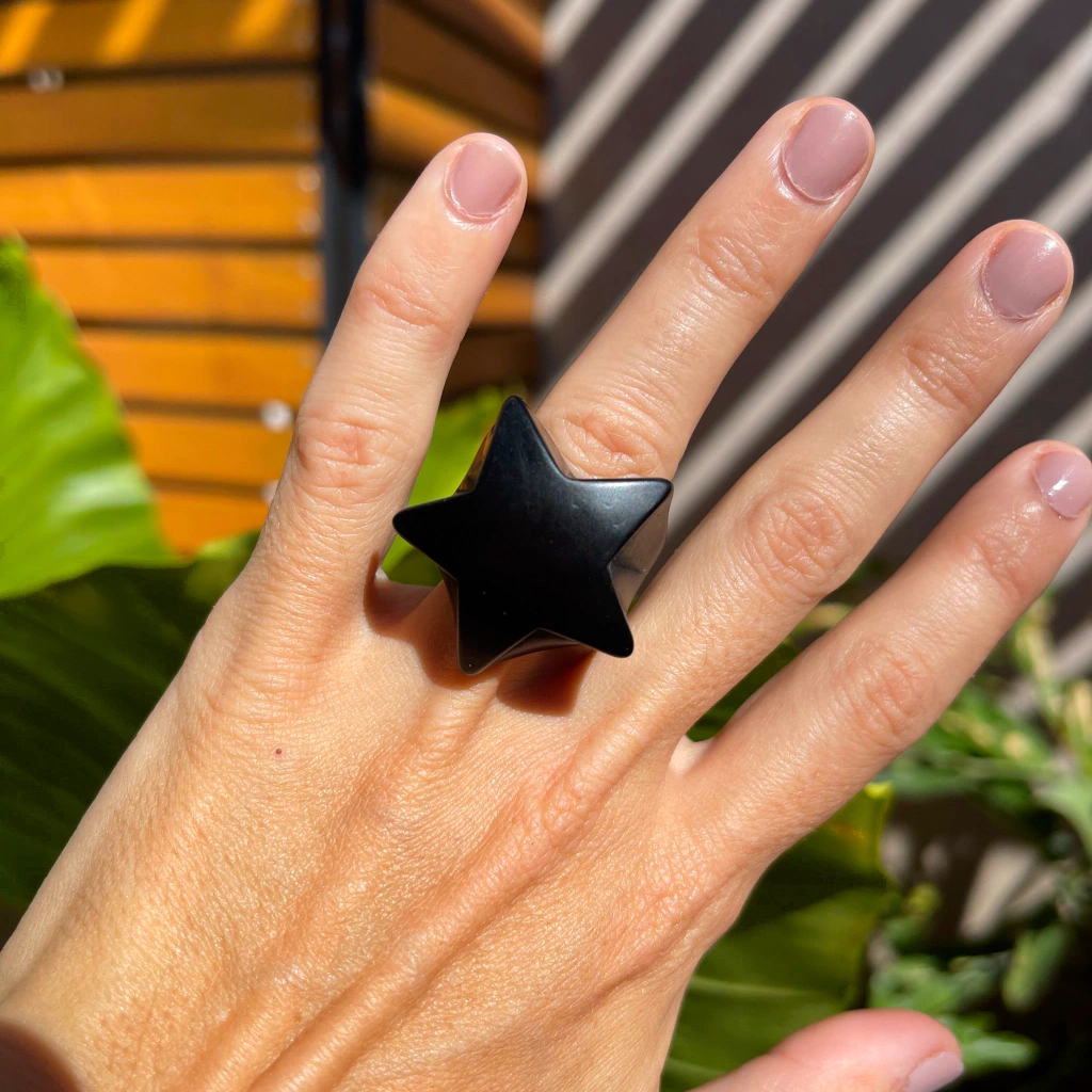 ¡Con el Anillo ESTRELLA vas a brillar como ninguna otra! Este accesorio único está hecho a mano con resina y está disponible en tres tamaños diferentes: S, L y XL. El tamaño S tiene un diámetro de aproximadamente 17mm, el tamaño L es de 19mm y el XL es de 21mm. Cada anillo es único debido a que están terminados a mano uno por uno, por lo que las medidas pueden variar ligeramente. ¡Atrevete a lucir esta pieza exclusiva de nuestra colección!