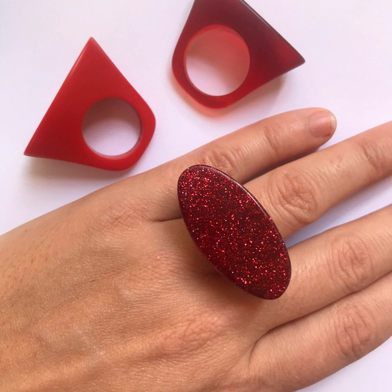 Anillos de resina enteramente realizados a mano. Vienen en 3 tamaños: S, L y XL. El talle S es 17mm aprox (diametro del agujero del anillo). El talle L es 19mm aprox. El talle XL es 21mm. Varían milesimas por estar terminados a mano uno por uno.