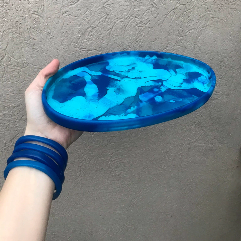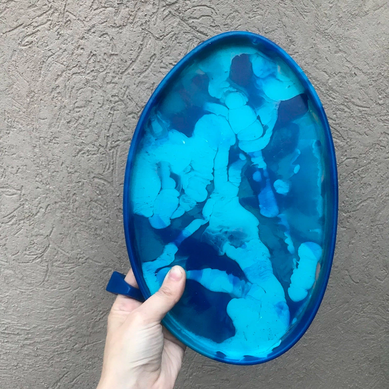 Pieza de formato orgánico, trabajada a mano en resina, con una terminación suave al tacto.