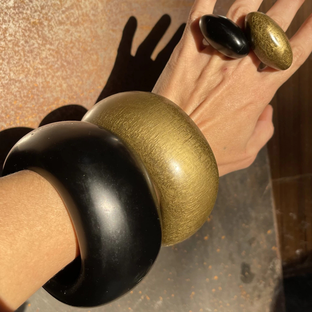 Úsalo en forma de #statementstack con las pulseras Adela, City y Body para un conjunto impactante y moderno. Cada pieza está cuidadosamente elaborada a mano, asegurando exclusividad y calidad en cada detalle.